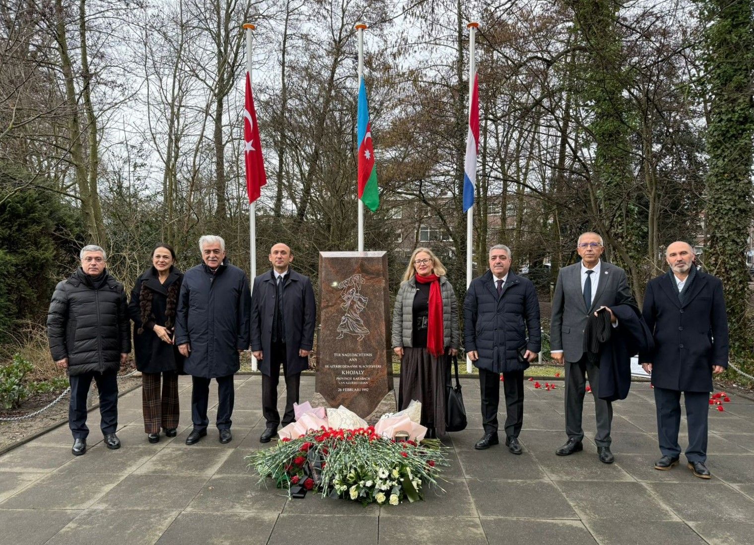 Сначала участники посетили мемориал, возведенный в память о жертвах Ходжалинского геноцида на кладбище Новый Эйкендуйнен (“Nieuw Eikenduynen”), минутой молчания почтили их память.