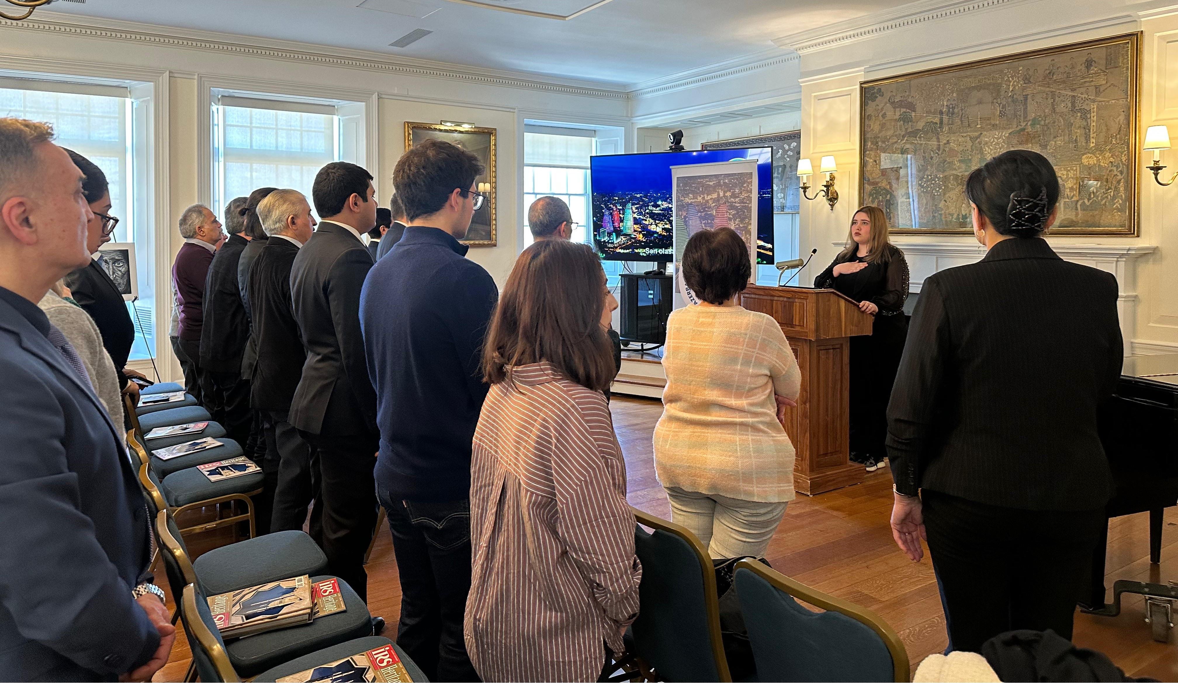 Сначала прозвучали государственные гимны Азербайджана и США, минутой молчания почтена светлая память жертв Ходжалинского геноцида.